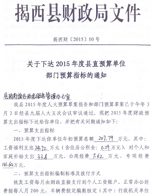 关于下达2015年度县直预算单位部门预算指标的通知
