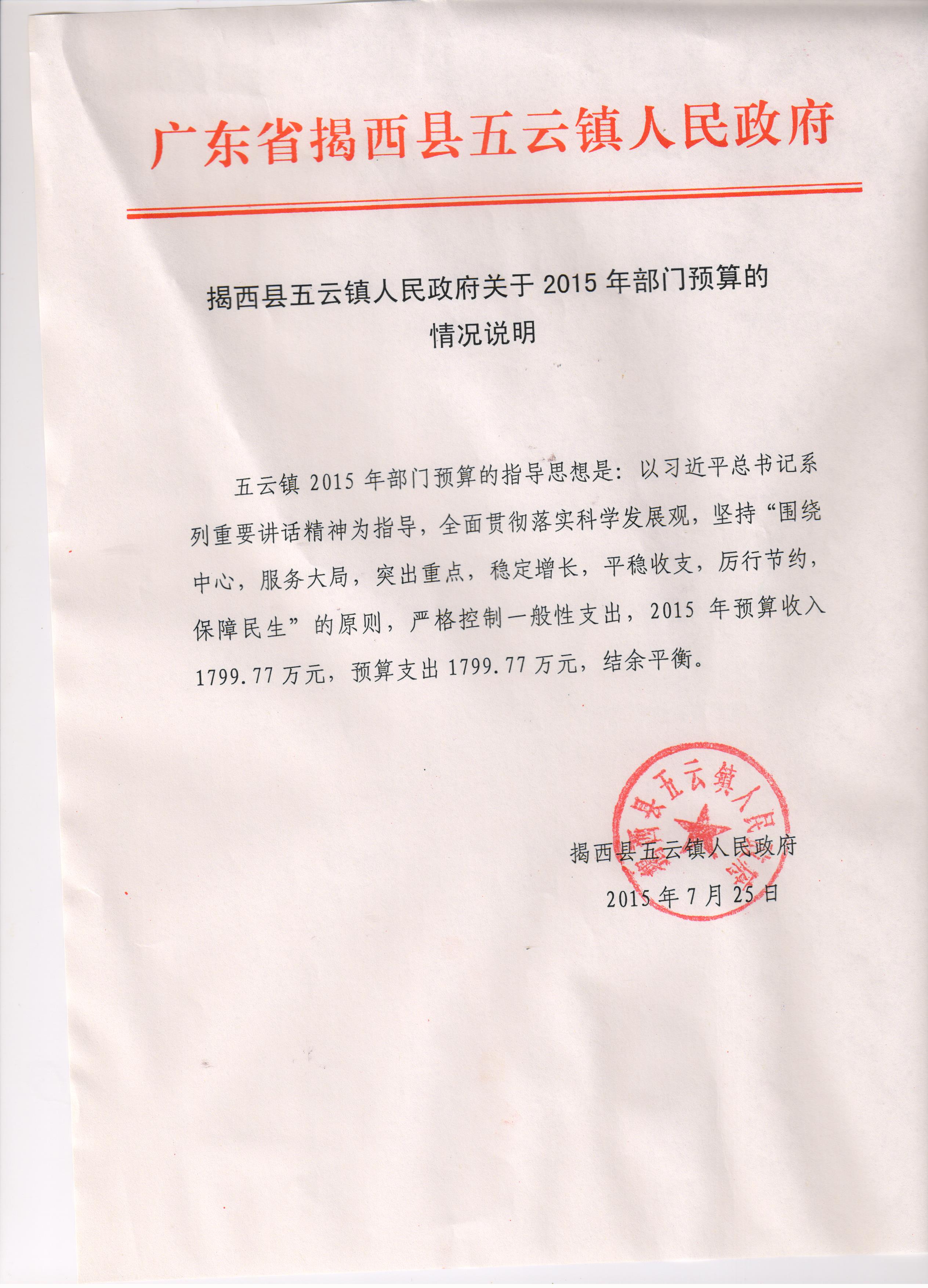 揭西县五云镇人民政府关于2015年部门预算的情况说明