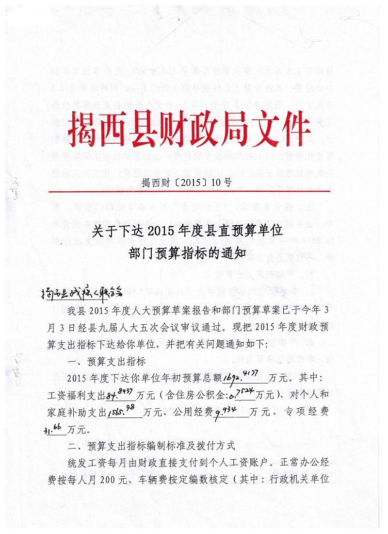 关于下达2015年度县直预算单位部门预算指标的通知