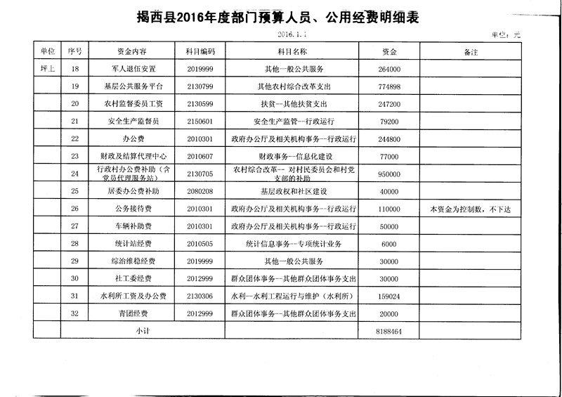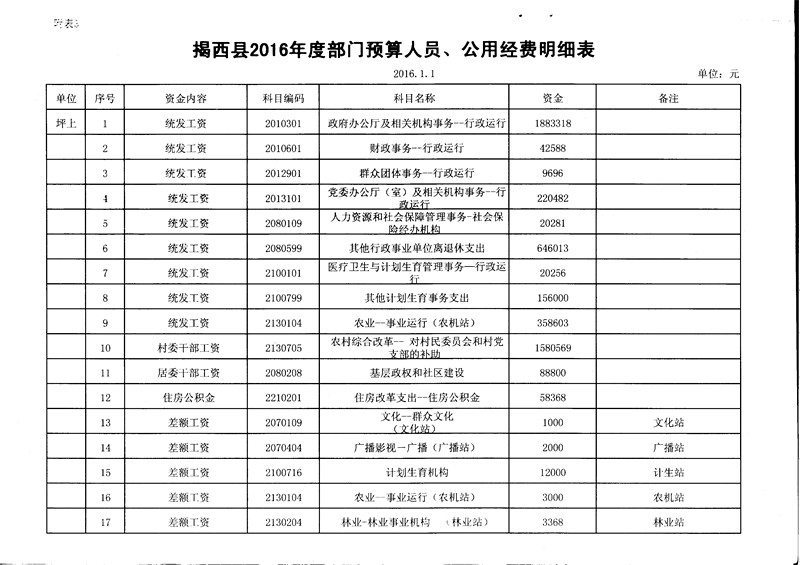 揭西县2016年度部门预算人员、公用经费明细表