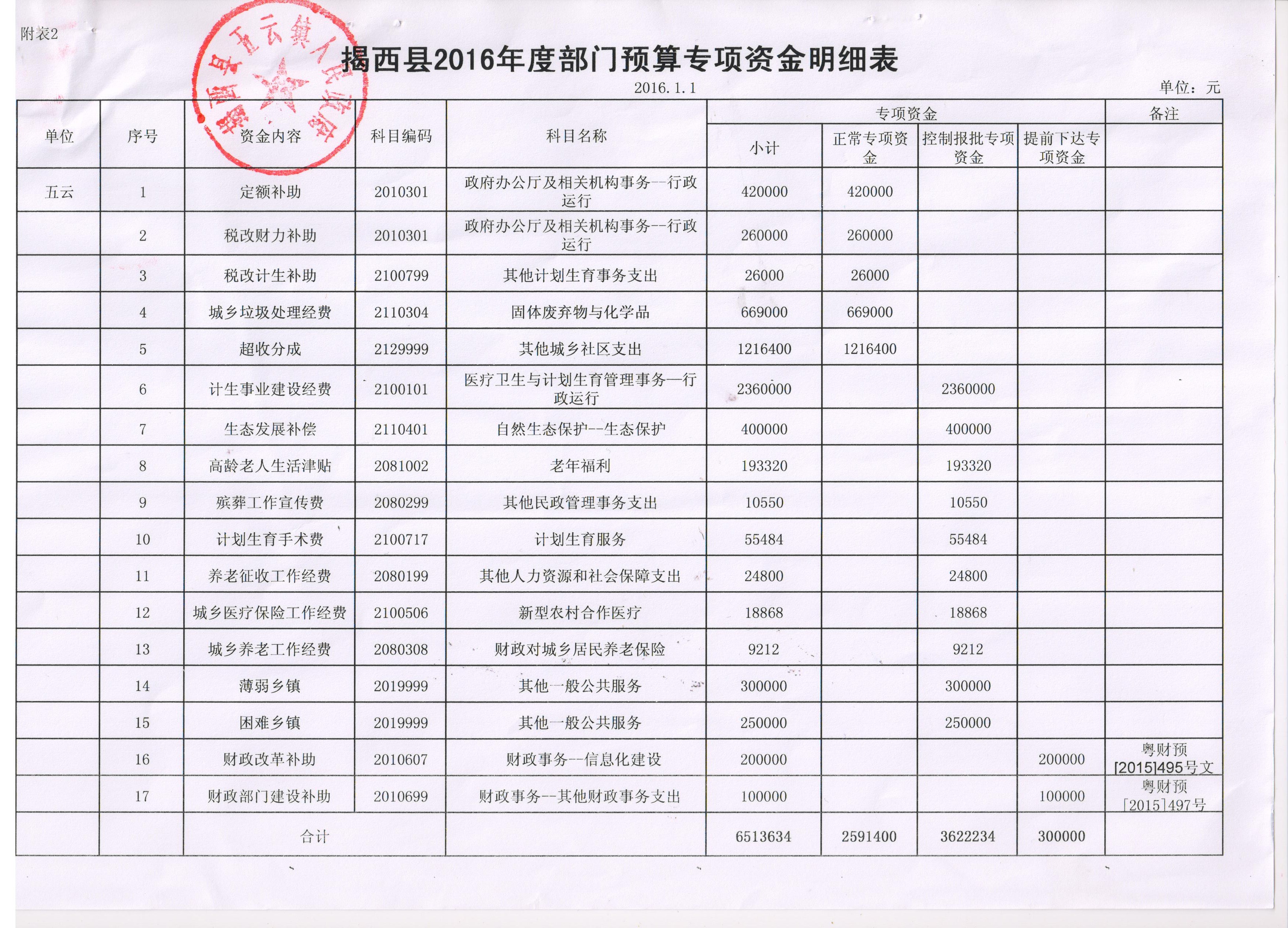 揭西县五云镇2016年度部门预算专项资金明细表