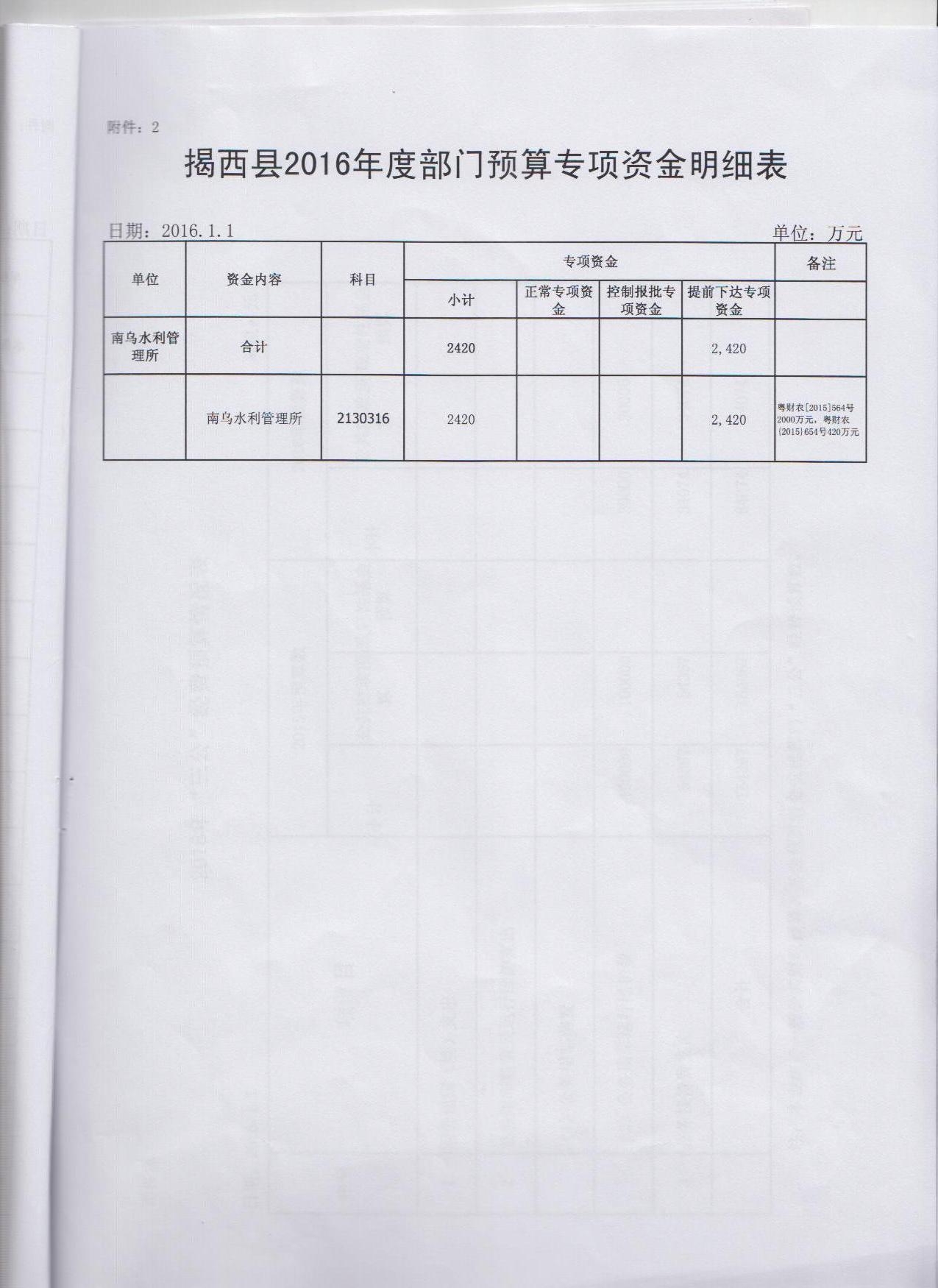 关于下达2016年度预算揭西县横龙线水利管理所单位部门预算指标的通知