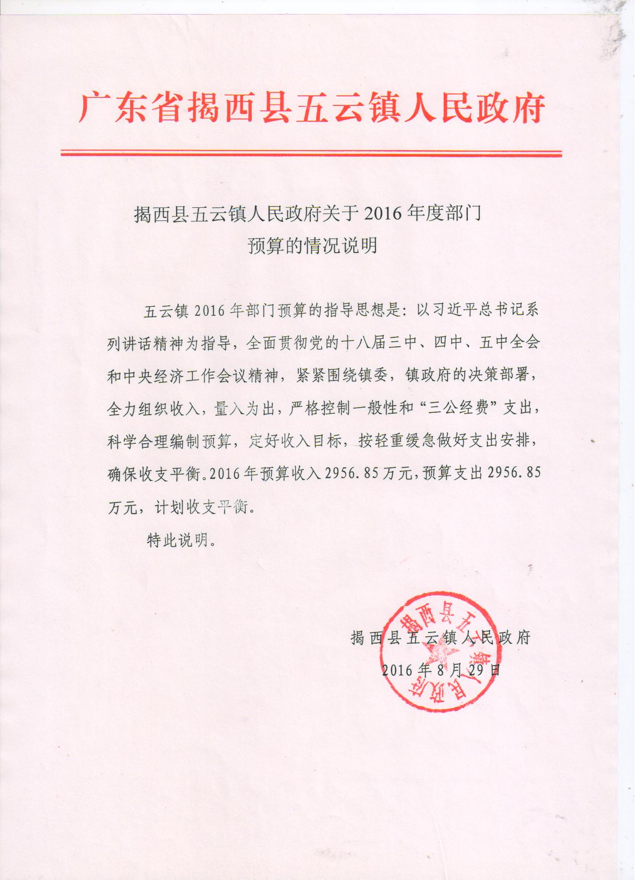 揭西县五云镇人民政府关于2016年度部门预算的情况说明