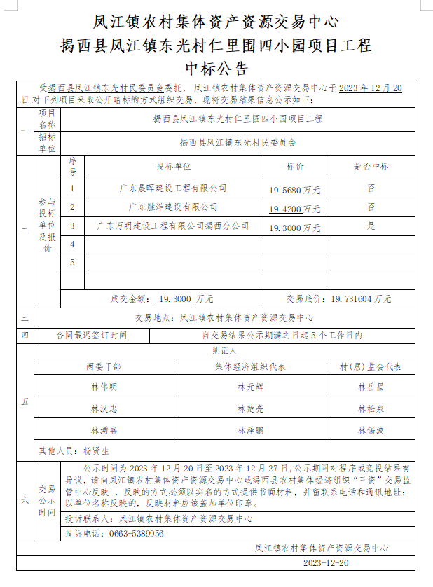 揭西县凤江镇东光村仁里围四小园项目工程中标公告