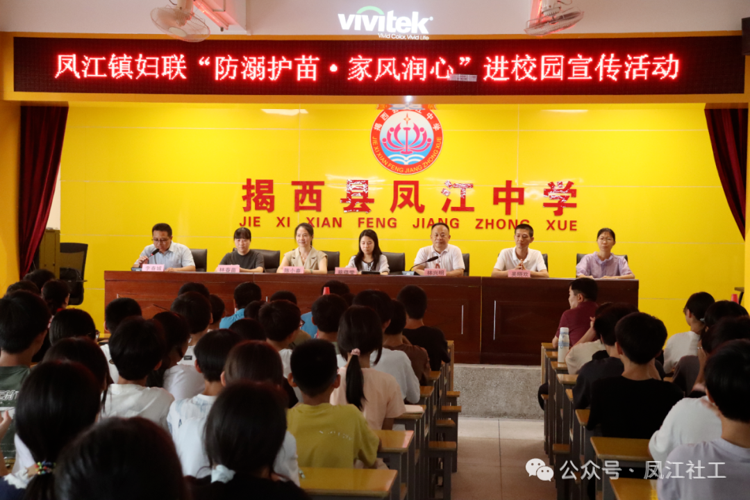 为提高学生防溺水意识,防止溺水事件发生,同时倡导家庭家风建设。2025年6月11日,凤江镇社工站联合凤江镇宣传办公室、凤江镇妇联共同来到凤江中学开展“防溺护苗--家风润心”校园宣传活动。