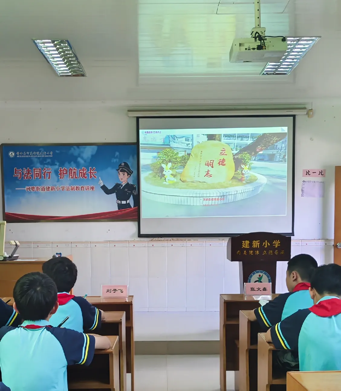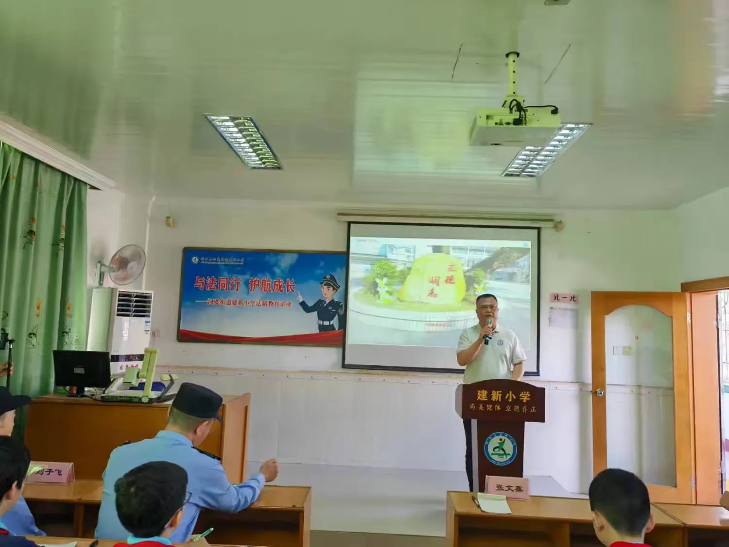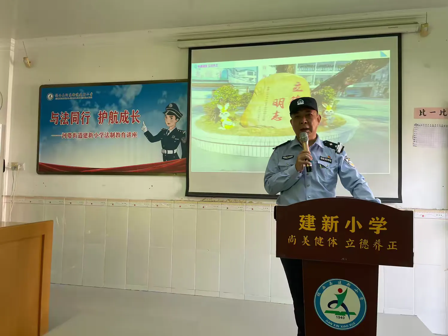 为深入贯彻落实揭西县教育局关于开展法治副校⻓2024 年 “ 以案说法” 专项活动的通知精神,进一步加强学校法治教育工作,增强学生的法治观念和自我保护意识,让同学们知法、懂法、守法、用法。11月12日下午,河婆街道派出所携手建新小学开展了法治副校⻓2024 年 “ 以案说法” 专项活动,教导员刘子飞同志、副所长陈广龙同志为全体师生带来一场通俗易懂又生动的法治教育讲座,全力助推平安校园、法治校园的建设。