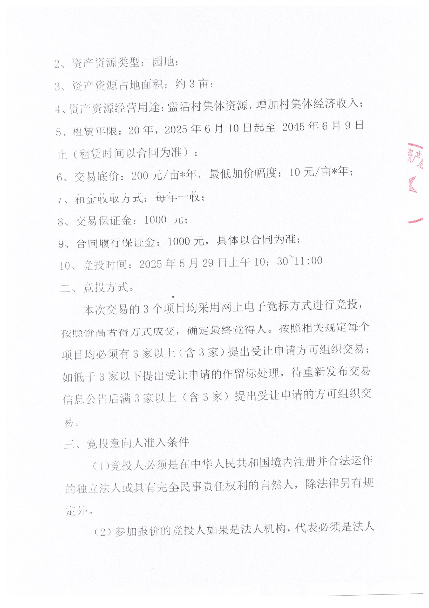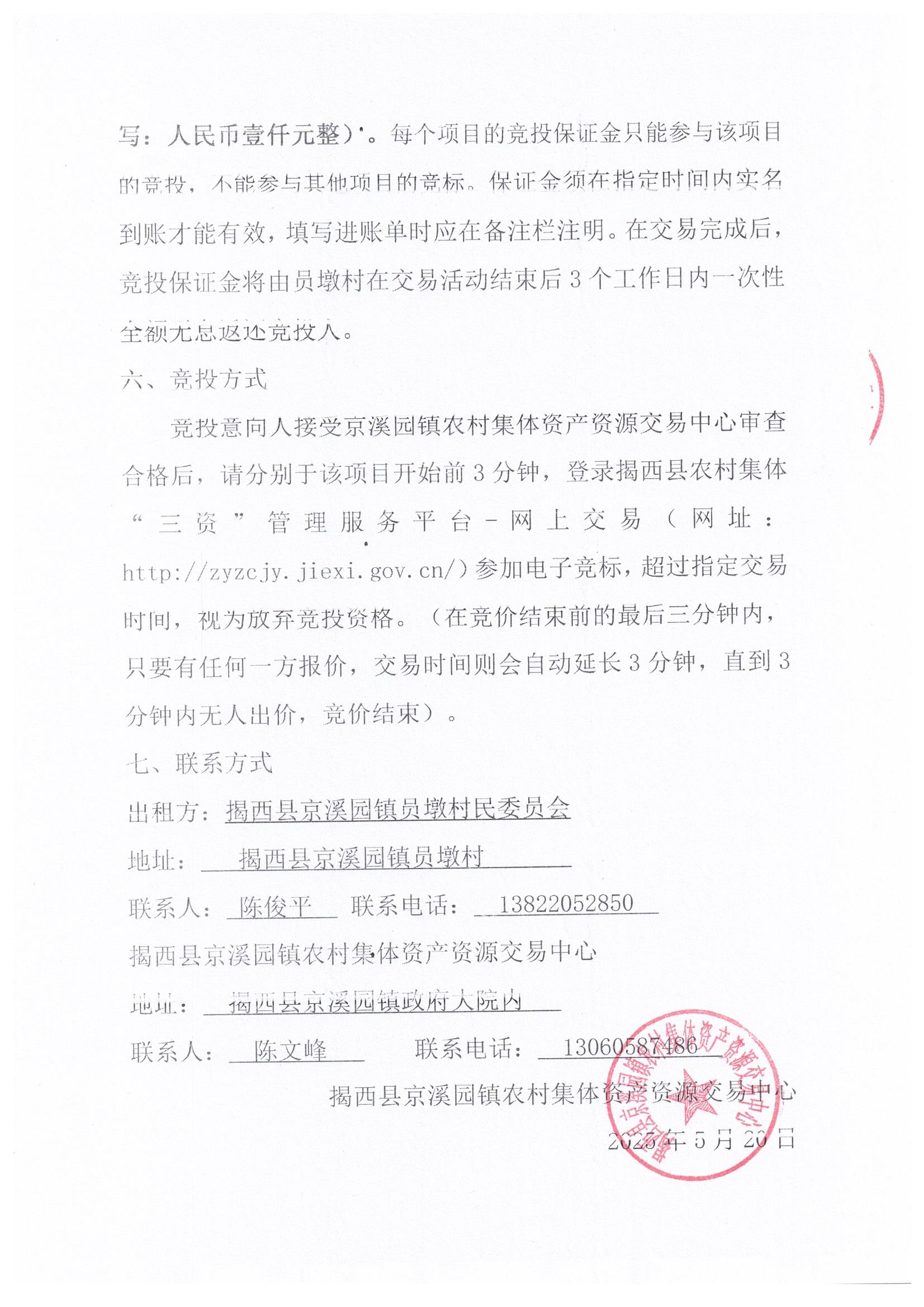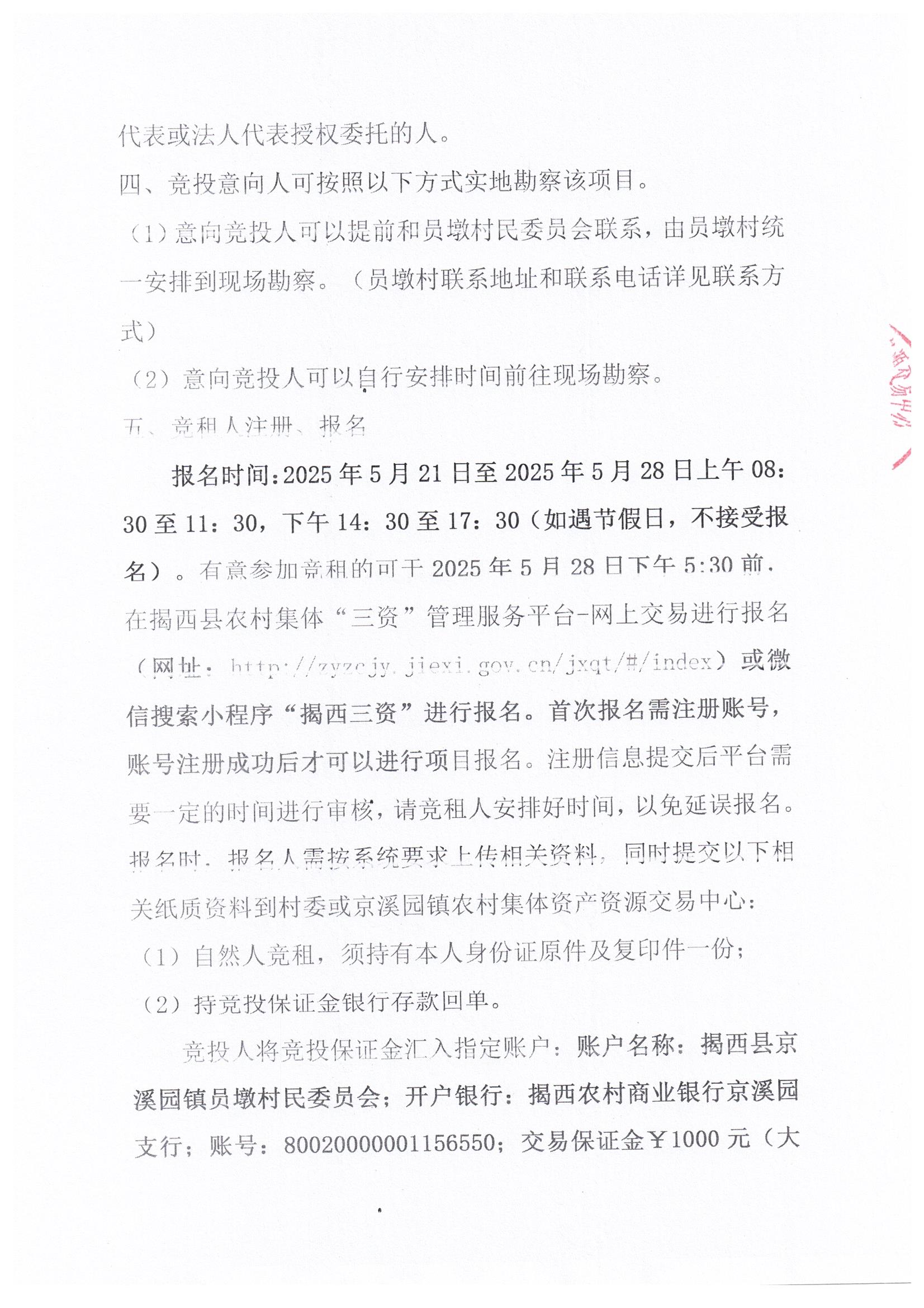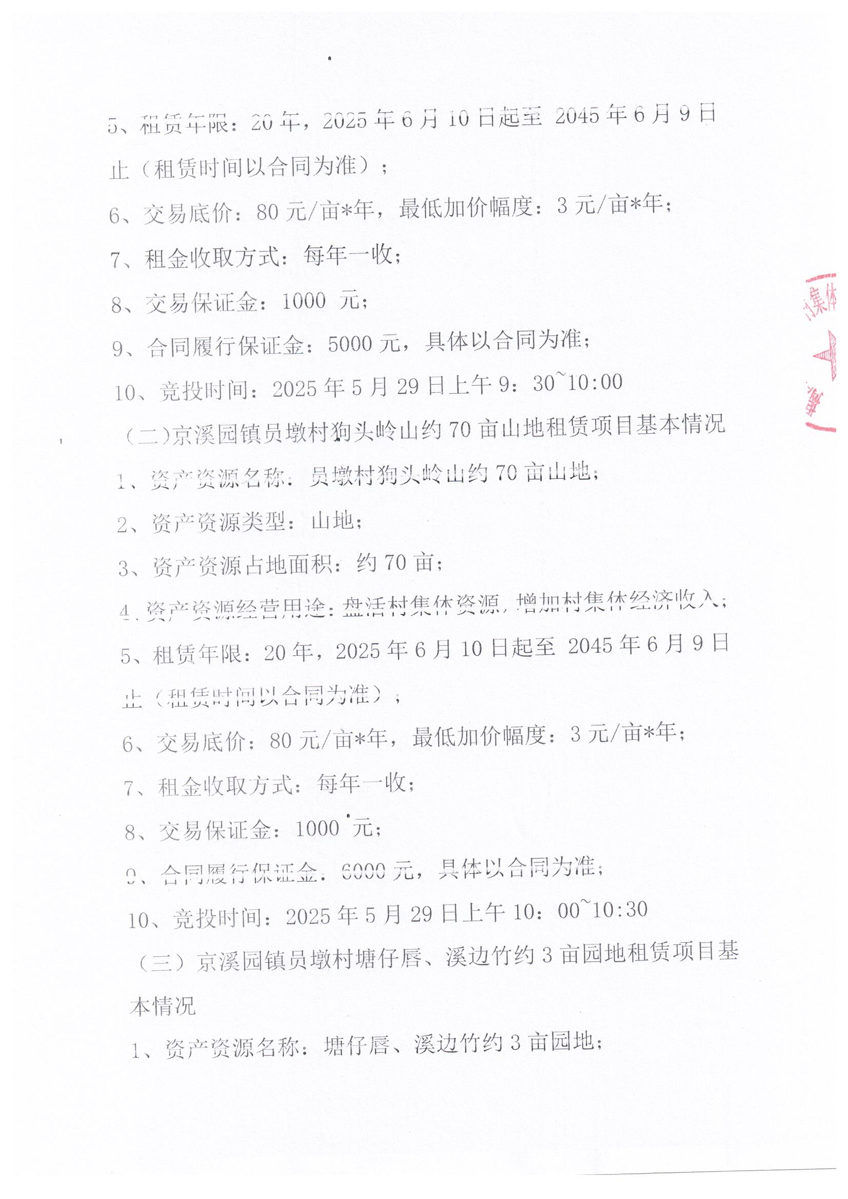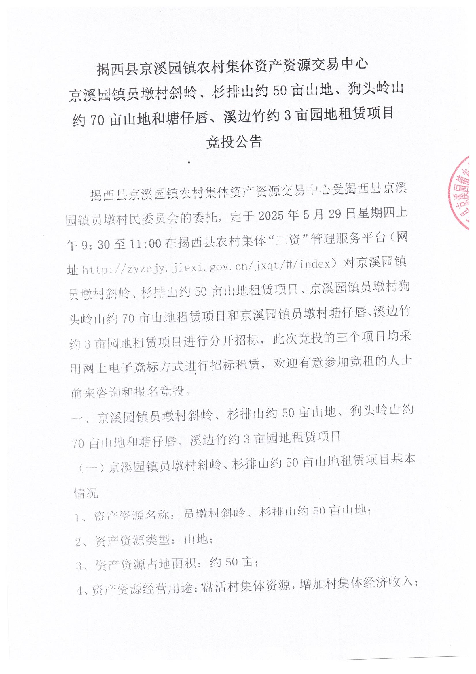 | 名称: | 京溪园镇员墩村斜岭、杉排山约50亩山地、狗头岭山约70亩山地和塘仔唇、溪边竹约3亩地租赁项目竟投公告 | ||
