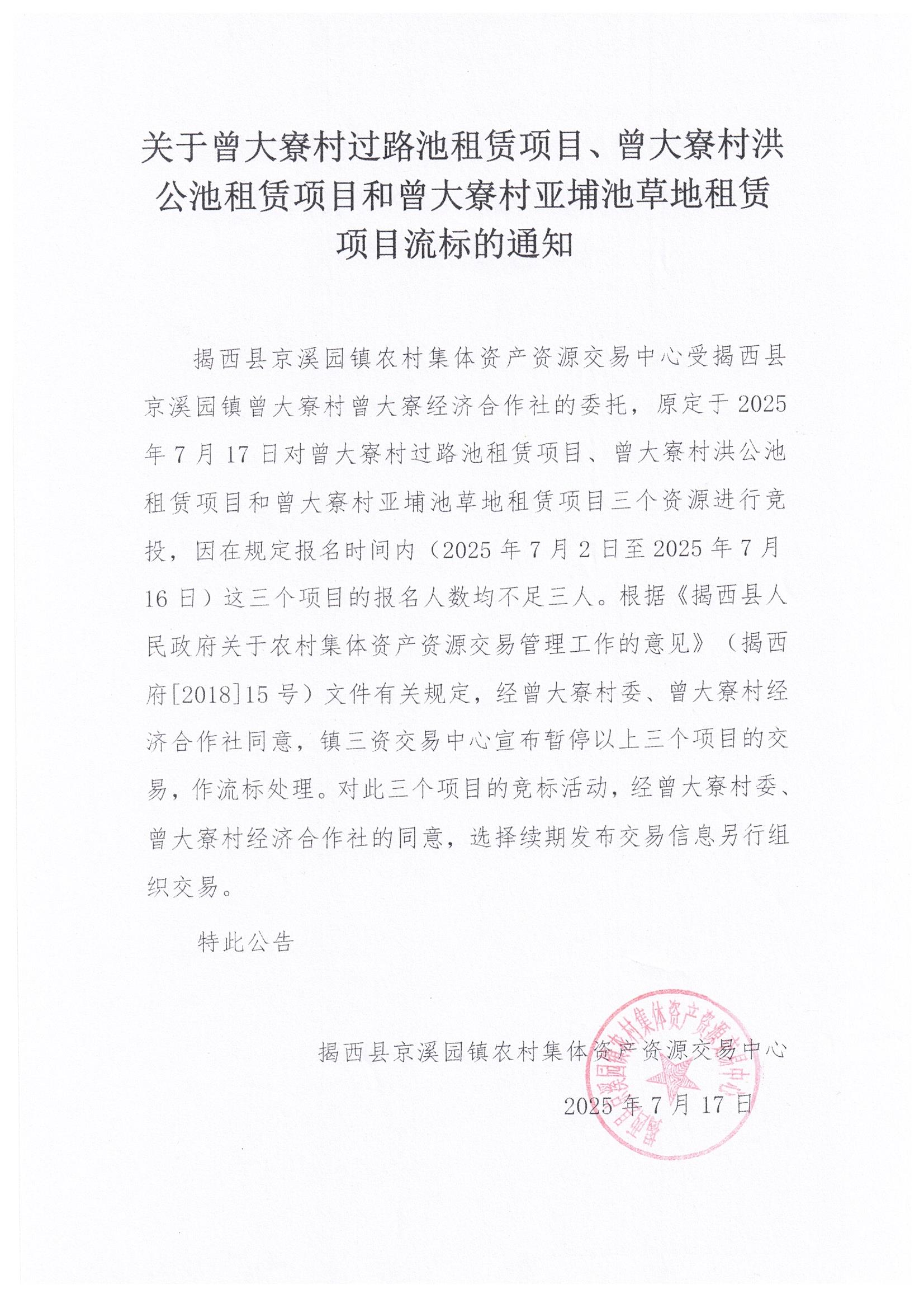 | 名称: | 关于曾大寮村过路池租赁项目、曾大寮村洪公池租赁项目和曾大寮村亚埔池草地租赁项目流标的通知 | ||