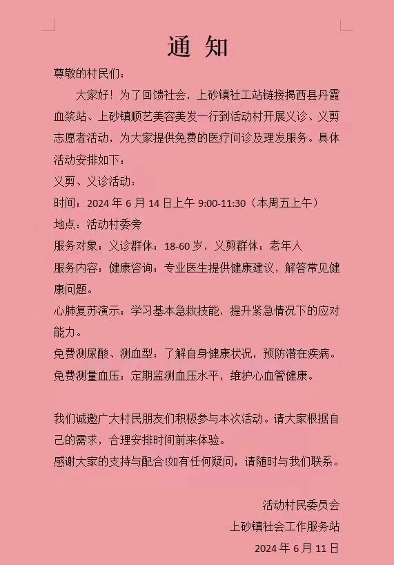 6月14日上午9:00-11:30,上砂镇社工站链接揭西县丹霞血浆站、上砂镇顺义美容美发一行到活动村开展义诊、义剪志愿者活动,为广大村民提供免费的医疗问诊及理发服务。