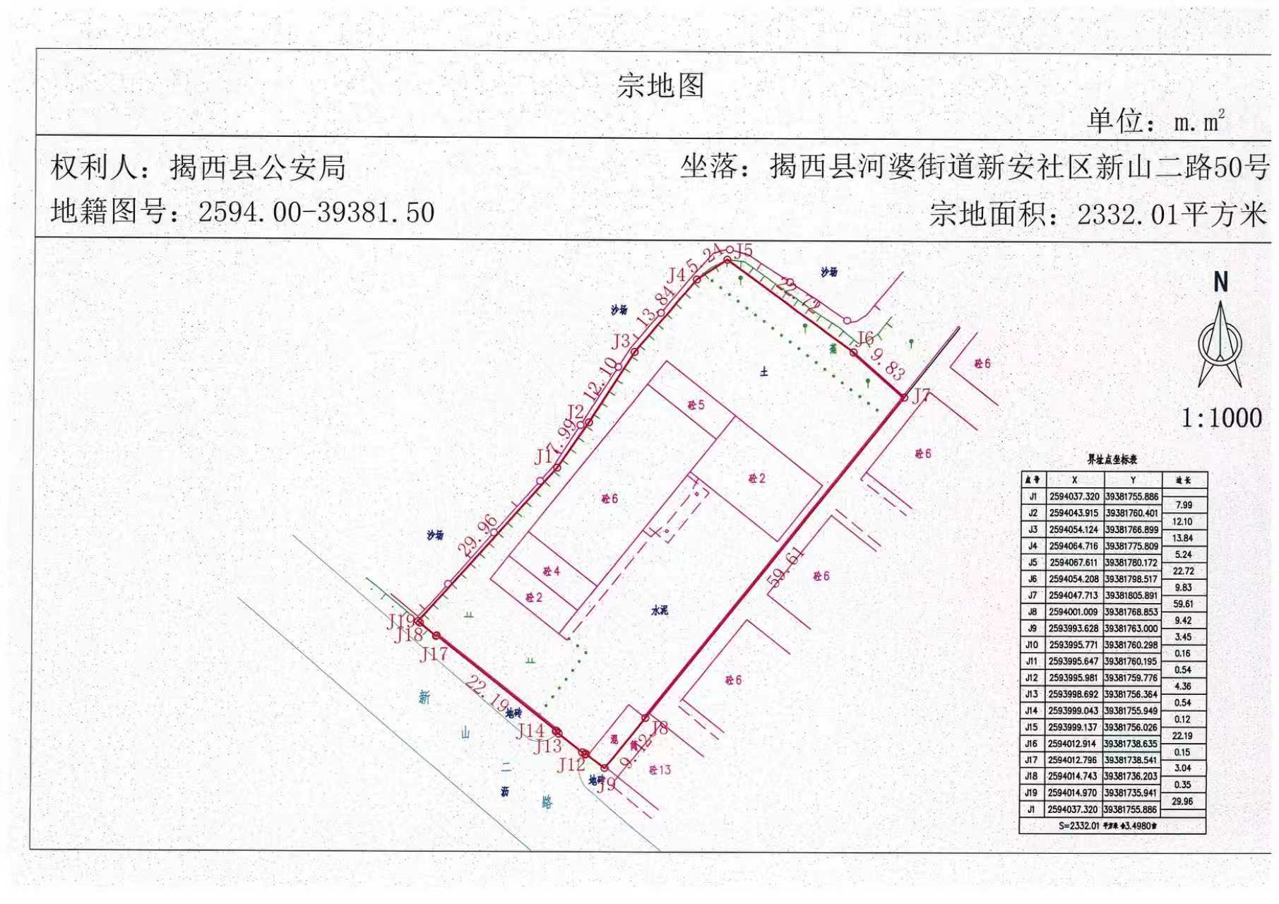 兹有揭西县机动车驾驶员协会办公楼,坐落位于揭西县河婆街道新安社区新山二路50号(原地址:揭西县河婆街道新安居委新山花园路38号),于1997年建成且于1999年办有《房屋所有权证》。经测量,揭西县机动车驾驶员协会办公楼用地面积2332.01平方米,其土地权属性质为国有土地,四至详见宗地图,至今未办理土地使用权权属登记。