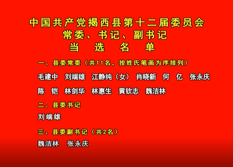 刘端雄、魏洁林、张永庆、林惠生、肖晓新、何亿、黄钦志、毛建中、林剑华、陈铠、江静纯当选为中国共产党揭西县第十二届委员会常务委员会委员,刘端雄当选为书记,魏洁林、张永庆当选为副书记。