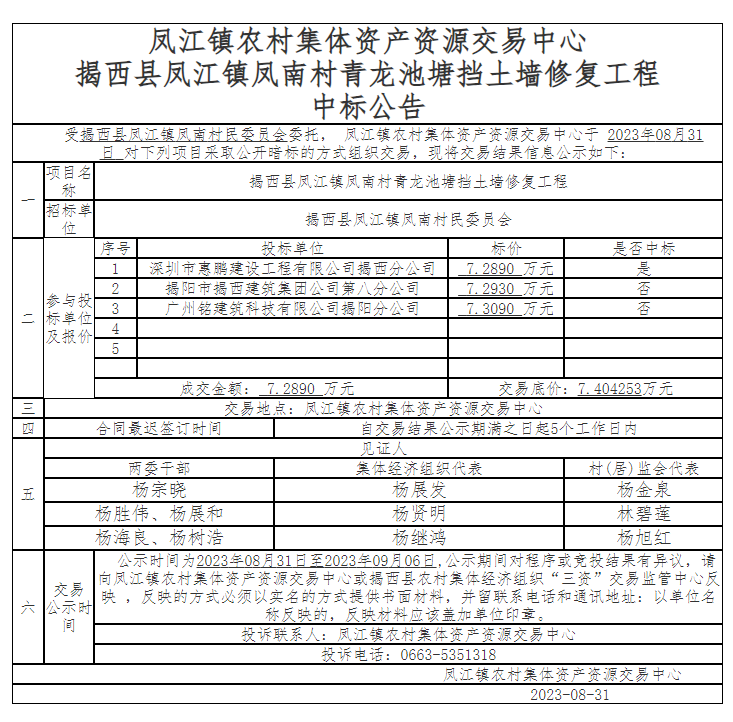 揭西县凤江镇凤南村青龙池塘挡土墙修复工程中标公告