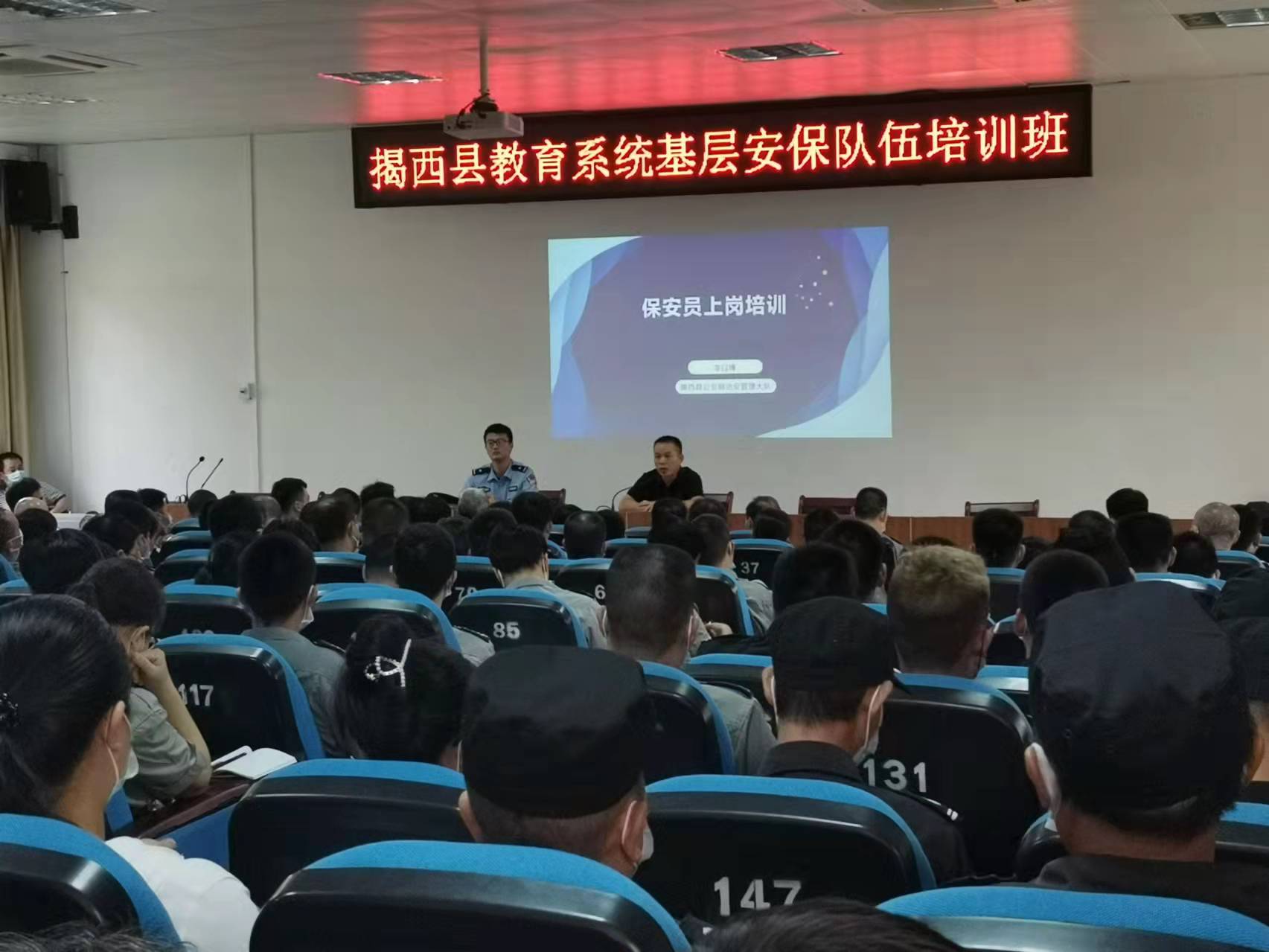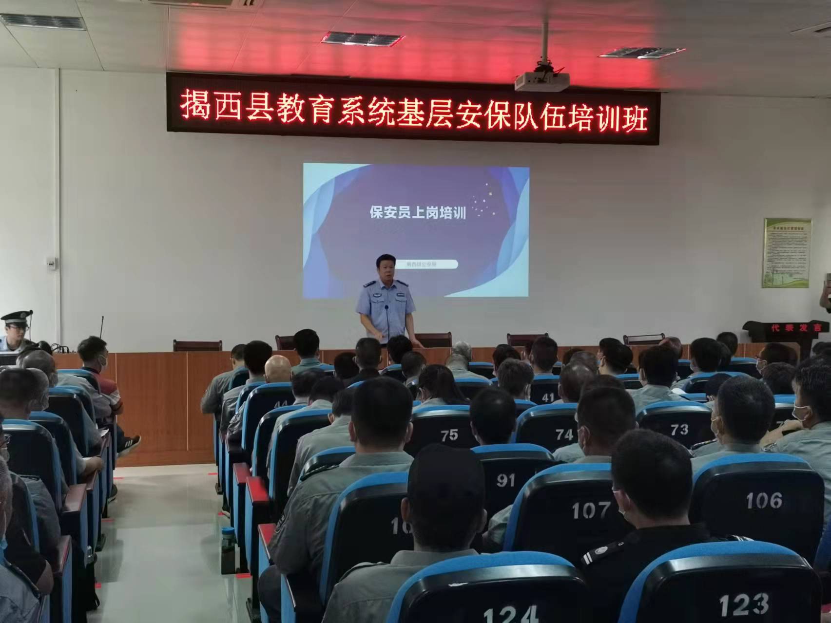 为深入学习贯彻落实习近平总书记关于应急管理、安全生产和防灾减灾重要论述,牢固树立以人民为中心的发展思想,中小学校幼儿园要严格按照校园保安员配备标准,配足配强保安力量,保证师生在校在园时的生命安全,按照今年校园安全大检查行动工作部署,为进一步提升中小学幼儿园基层安保队伍处置能力和水平,减少安全事故造成的人员伤亡和财产损失,揭西县教育局、公安局10月14日组织中小学、幼儿园自招安保人员在揭西县第一职业技术学校进行培训,培训班内容由理论培训、技能培训和笔试测试组成。