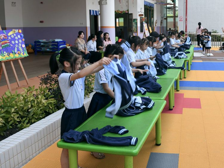 💪💪“预备,开始!”大班的小朋友们在老师们和场下小朋友的加油声中,迅速地开展了叠衣服比赛。